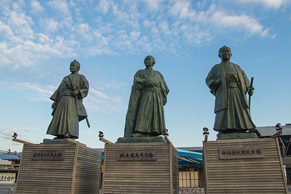 In front of Kōchi Station, statues of these three men stand side by side, from left to right: Hanpeita, Ryōma, and Shintarō.